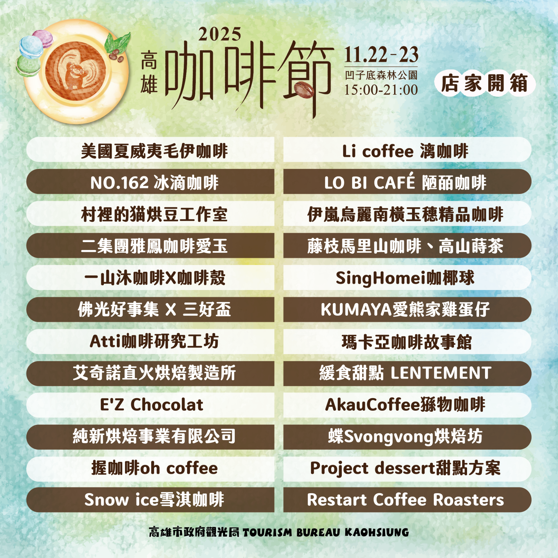 觀光局長高閔琳表示,今年咖啡節匯聚 60 家專業咖啡與甜點品牌,最大亮點就是冠軍級咖啡品牌齊聚,包括世界盃烘豆賽冠軍「握咖啡 Oh Coffee」、澳洲國際咖啡烘焙賽總冠軍「艾奇諾直火烘焙製造所」、國際咖啡杯測大師賽冠軍茂林「一山沐咖啡屋」、2023 高雄大港盃咖啡國際交流賽冠軍「E'Z Chocolat」,以及榮獲2025布魯塞爾世界烈酒大賽金獎的「鴻興製酒」咖啡蘭姆酒等。另有來自高雄原鄉的13家特色咖啡店,包含茂林的「林老師卡好咖啡」、「一山沐咖啡X咖啡殼」、那瑪夏的「僑香咖啡」、桃源區的「伊嵐烏麗南橫玉穗精品咖啡」、「Li coffee 漓咖啡」等,以在地咖啡豆結合專業發酵與烘焙技術,呈現高雄山林獨有的風味,展現原鄉產地直送、低碳綠色消費的理念。