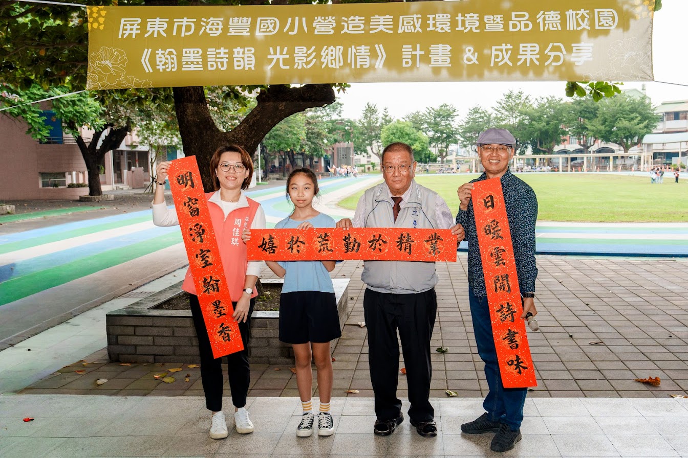 【記者黃婉柔/屏東訊】在秋意漸濃的時節,屏東市海豐國小以一場融合書法與攝影的藝術饗宴,為校園注入深厚的人文底蘊。為深化品德教育、營造美感環境,該校自113年啟動《翰墨詩韻 光影鄉情》計畫,邀集16位藝術家無償提供作品,透過翰墨之韻與光影之情,打造一座文化與美感交織的教育場域。