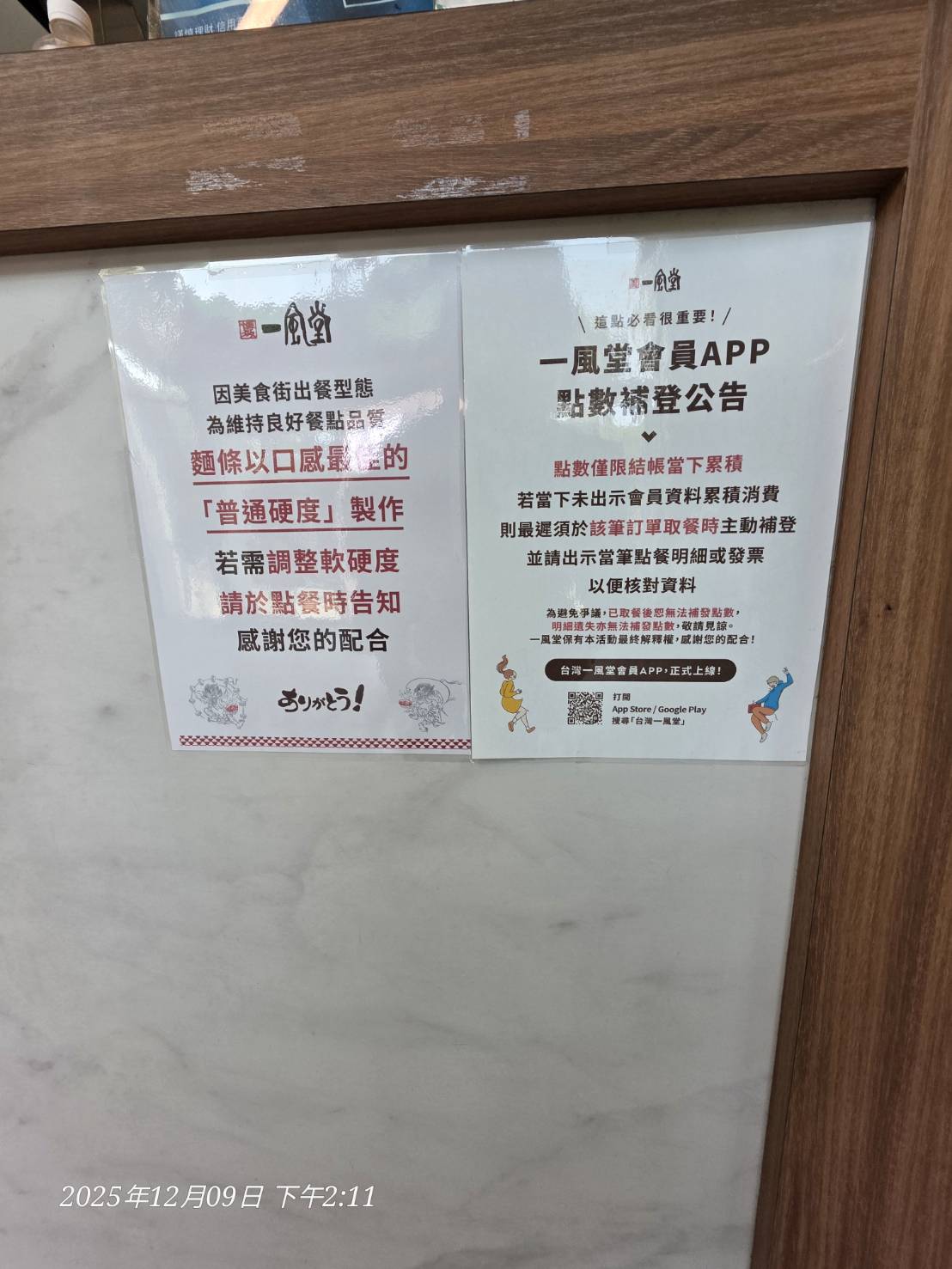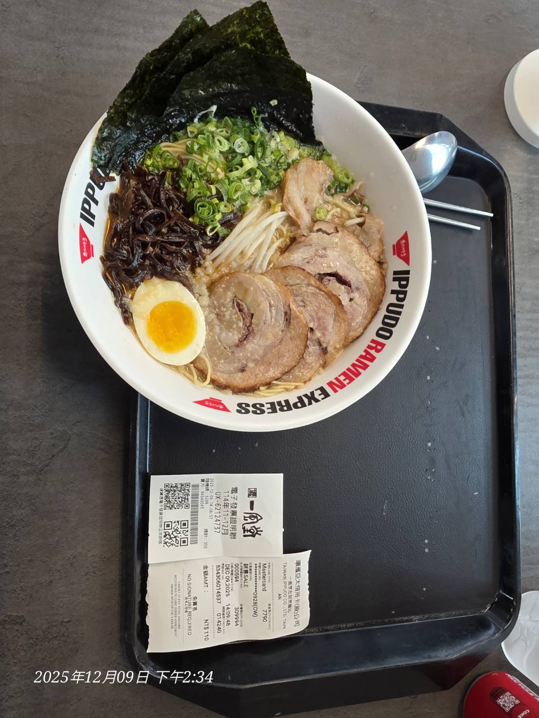 2025/12/9, 14:08,彭先生在高雄左營高鐵一樓一風堂日式拉麵,點了一碗特製白丸,價格350,(見照片一)