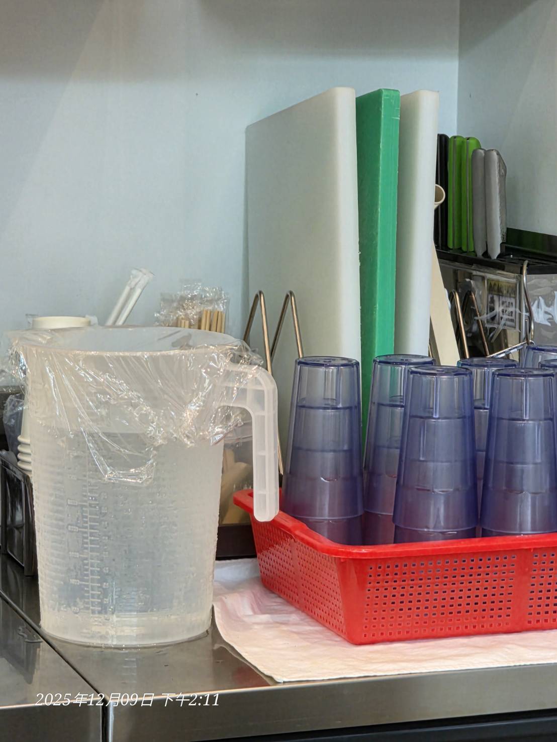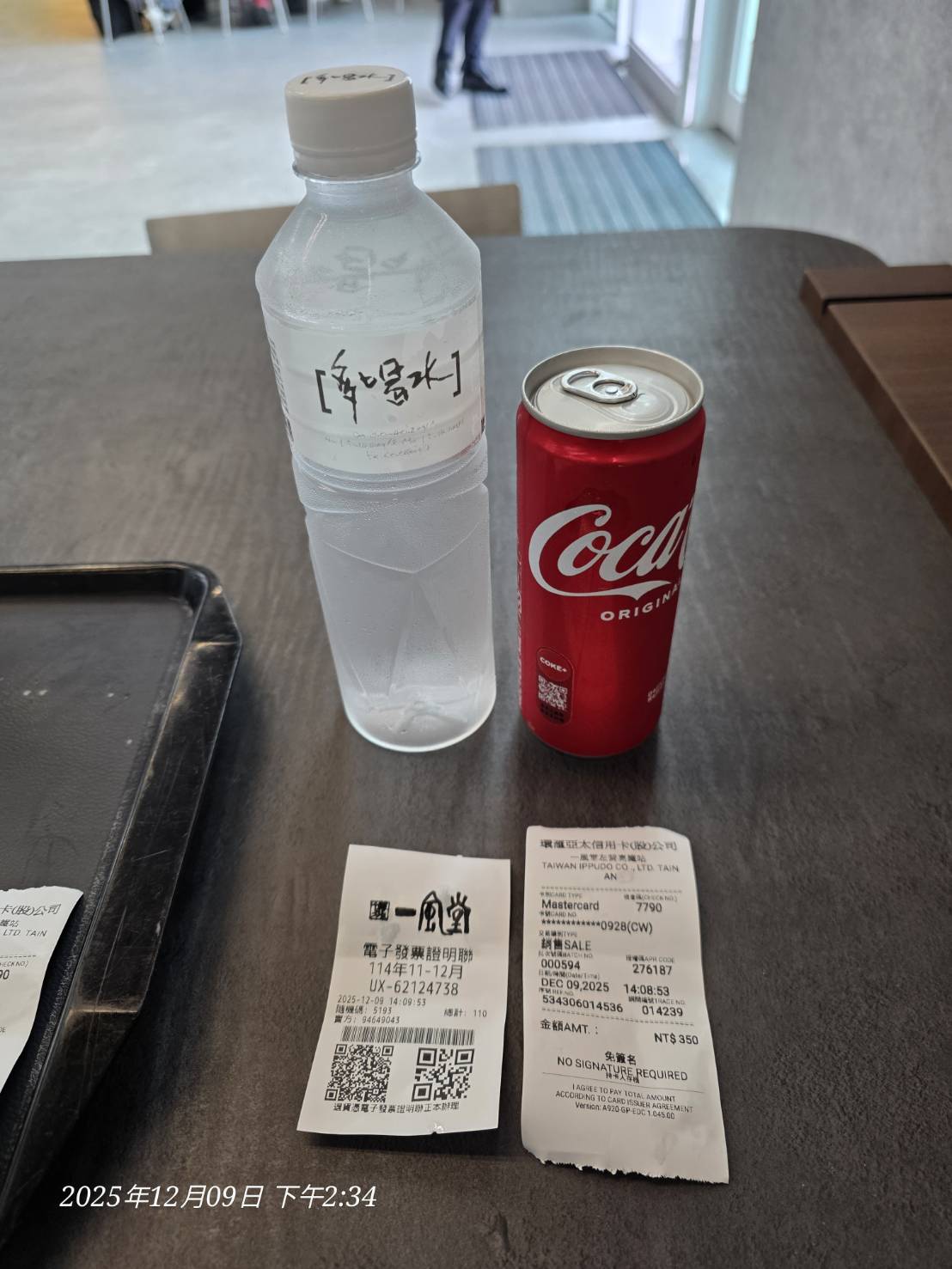 之後口渴問女店員說:有沒水?她說沒有。我看見櫃台後有水及十多個塑膠杯(見照片二),就問她:那是甚麼?她說那不能喝,我就另買瓶水及可樂,價格是110元(見照片三)。