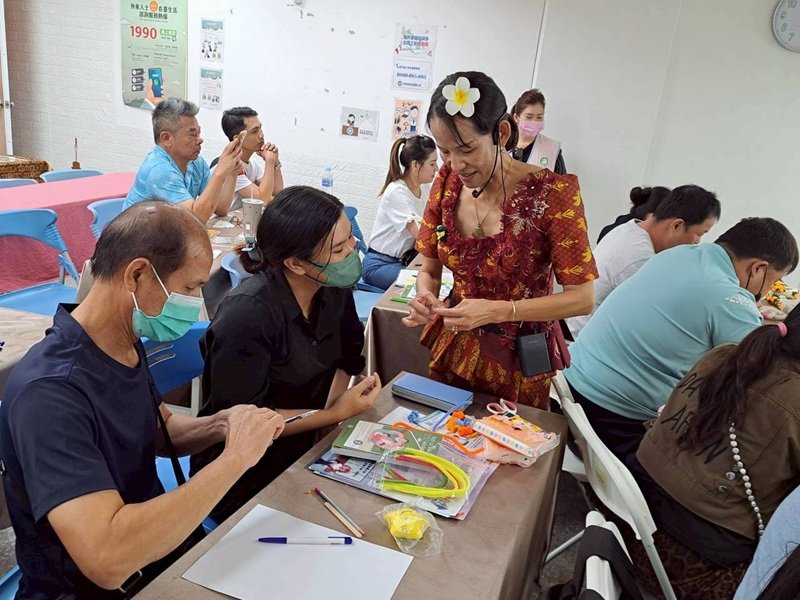 課程也安排學員手作花環飾品,利用簡單的材料,透過徐閤芸的指導與示範,讓參與的新住民夫妻發揮巧思與創意,編織出豐富色彩的花環飾品,讓每位學員感受不一樣的柬國文化。