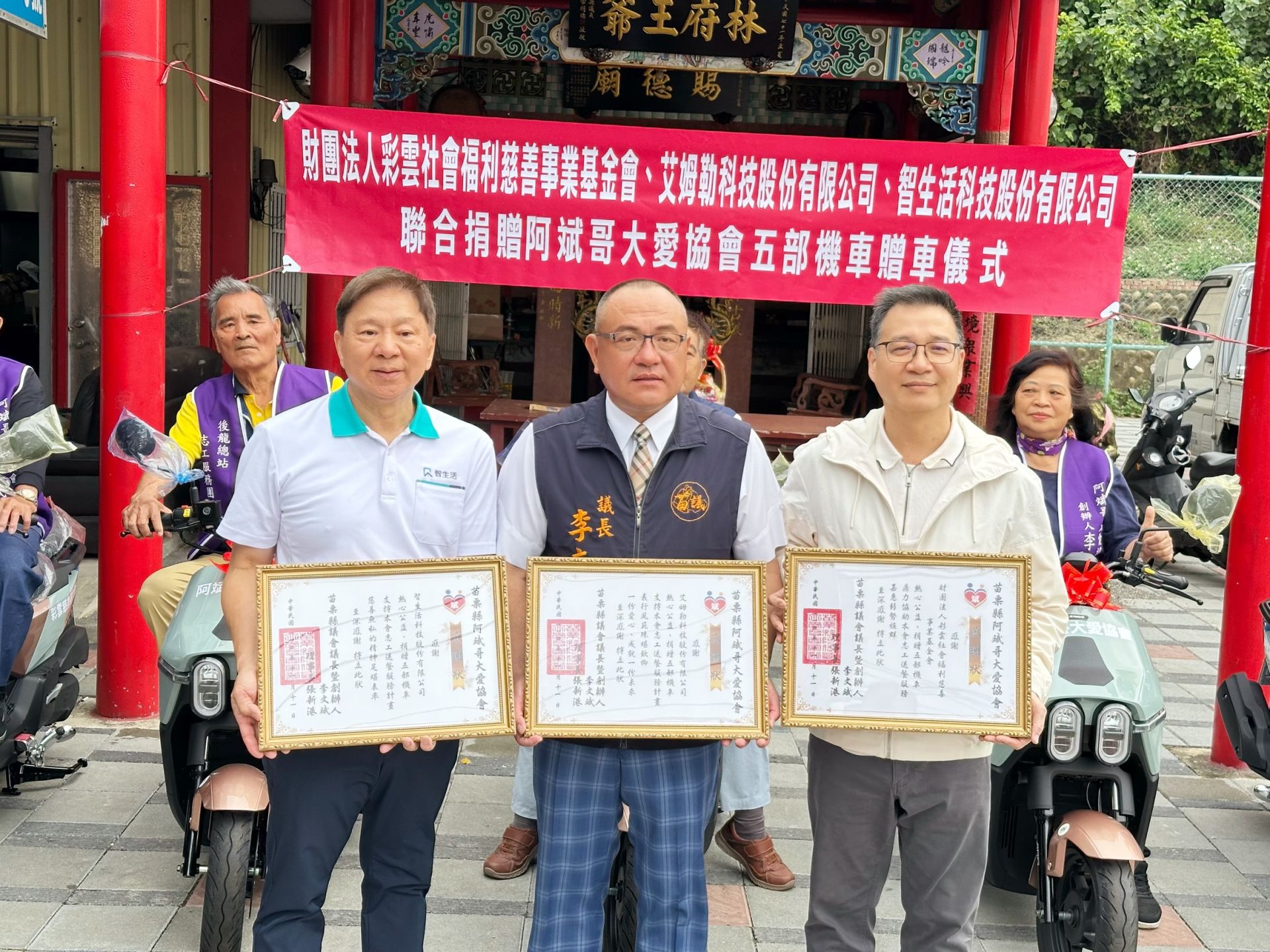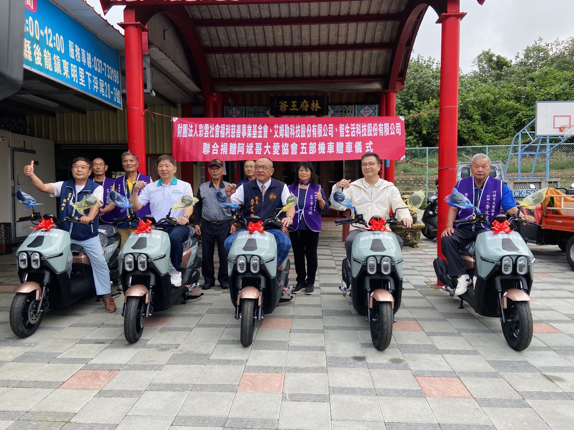 財團法人彩雲社會福利慈善事業基金會、艾姆勒科技股份有限公司及智生活科技股份有限公司,長期秉持回饋社會、扶助弱勢的理念,今(11)日攜手苗栗縣阿斌哥大愛協會於「愛心站」舉行聯合捐贈儀式,共捐贈五部150CC新機車,每部價值10萬元,總金額達50萬元,協助提升送餐志工服務效率與安全性。